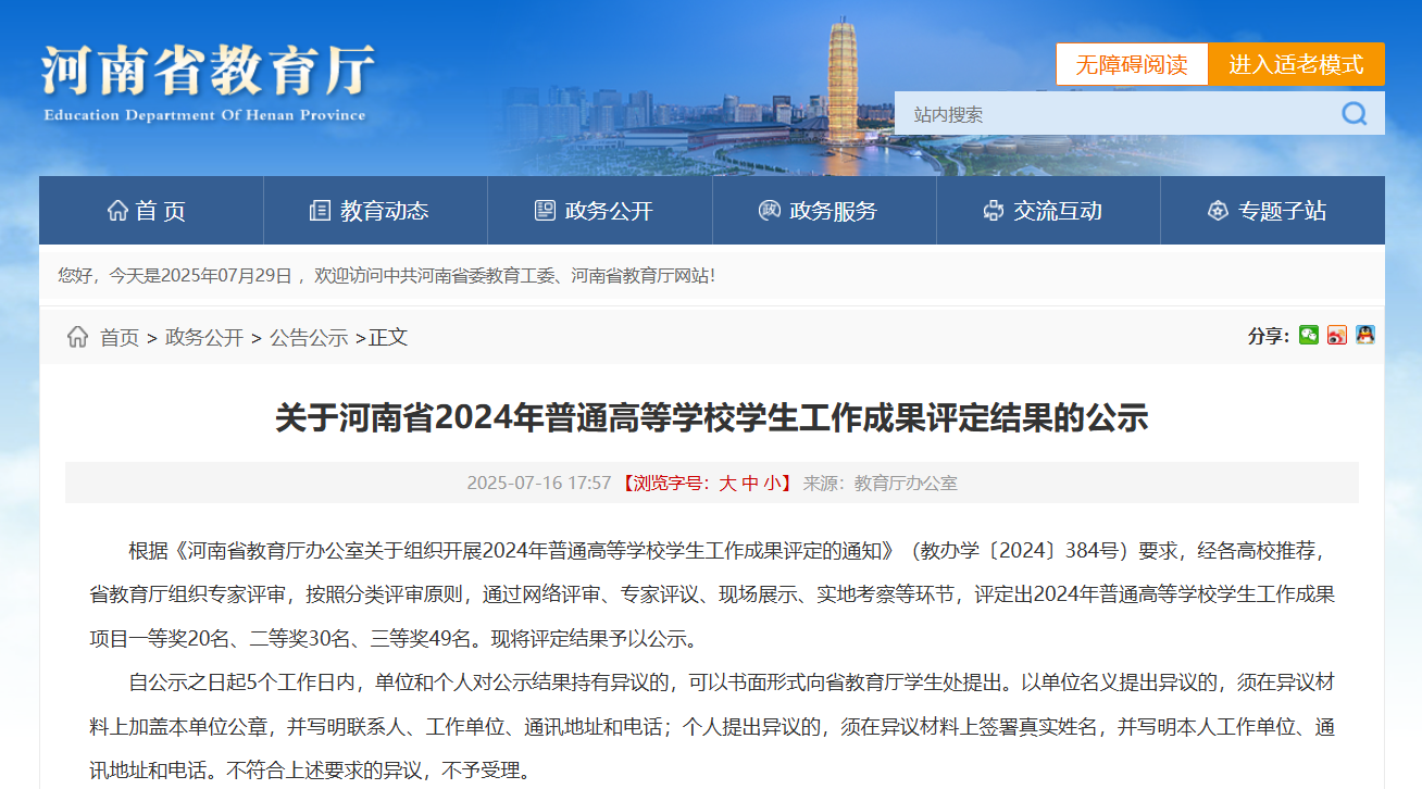 近日,河南省教育厅公布《关于河南省2024年普通高等学校学生工作成果评定结果的公示》。我校大学生心理健康教育中心申报的2024年学生工作成果《六体联动,润“心”育人》项目荣获二等奖。