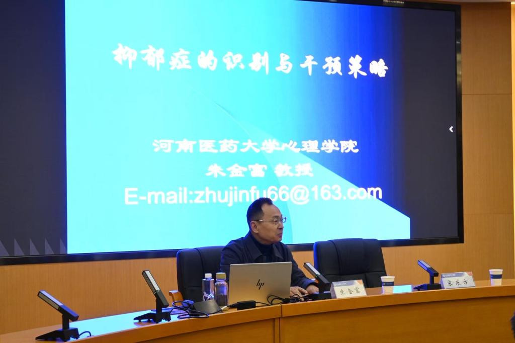 11月15日上午,学工部邀请河南医药大学心理中心主任朱金富教授,在行政楼239会议室进行“抑郁症的识别与干预策略”专题讲座。讲座由学工部部长宋东方主持,各二级学院党总支书记、党总支副书记、专兼职辅导员,保卫处和后勤处负责人,心理健康专兼职教师等共计140余人参加。